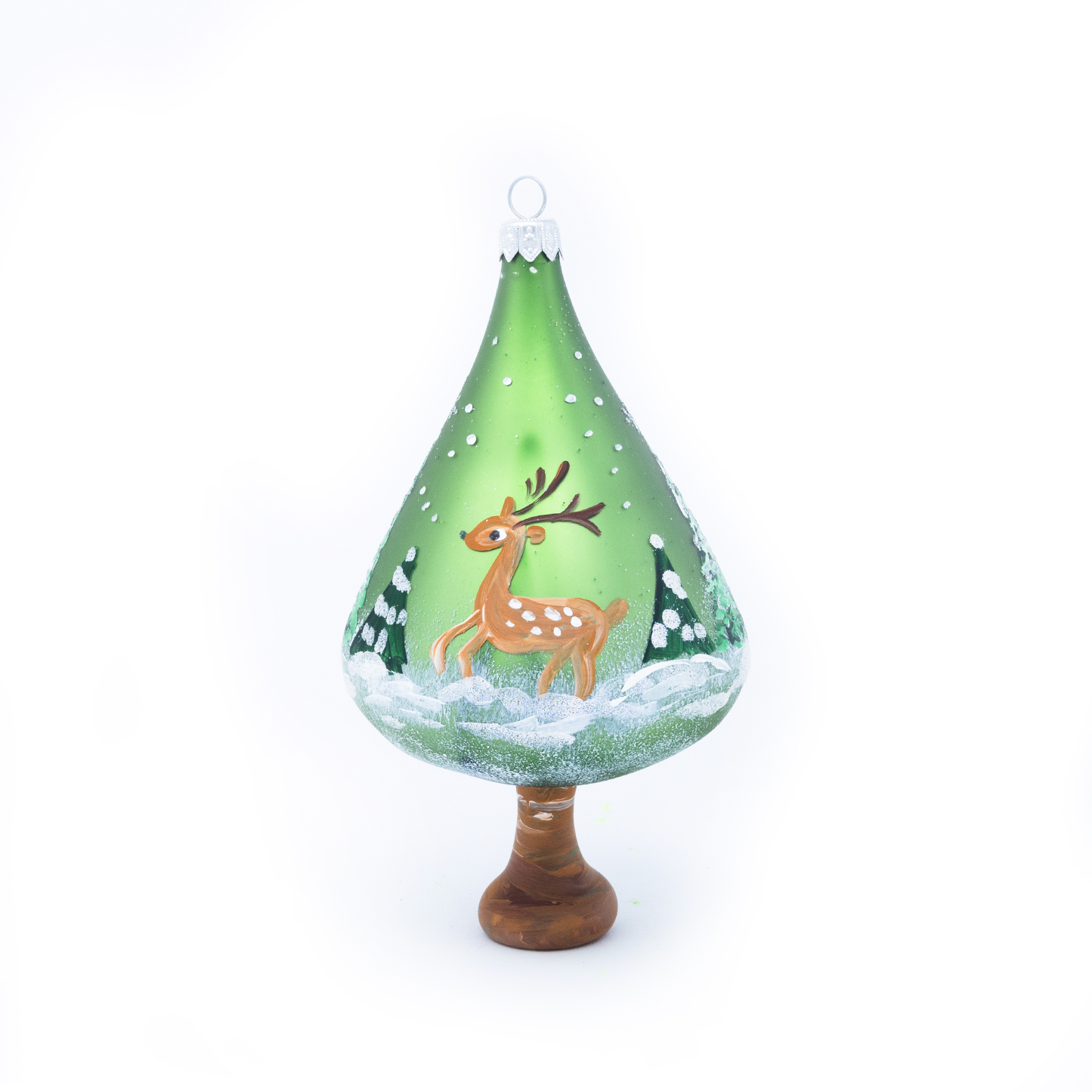 Matt green blown glass tree with reindeer to hang, H.12cm.