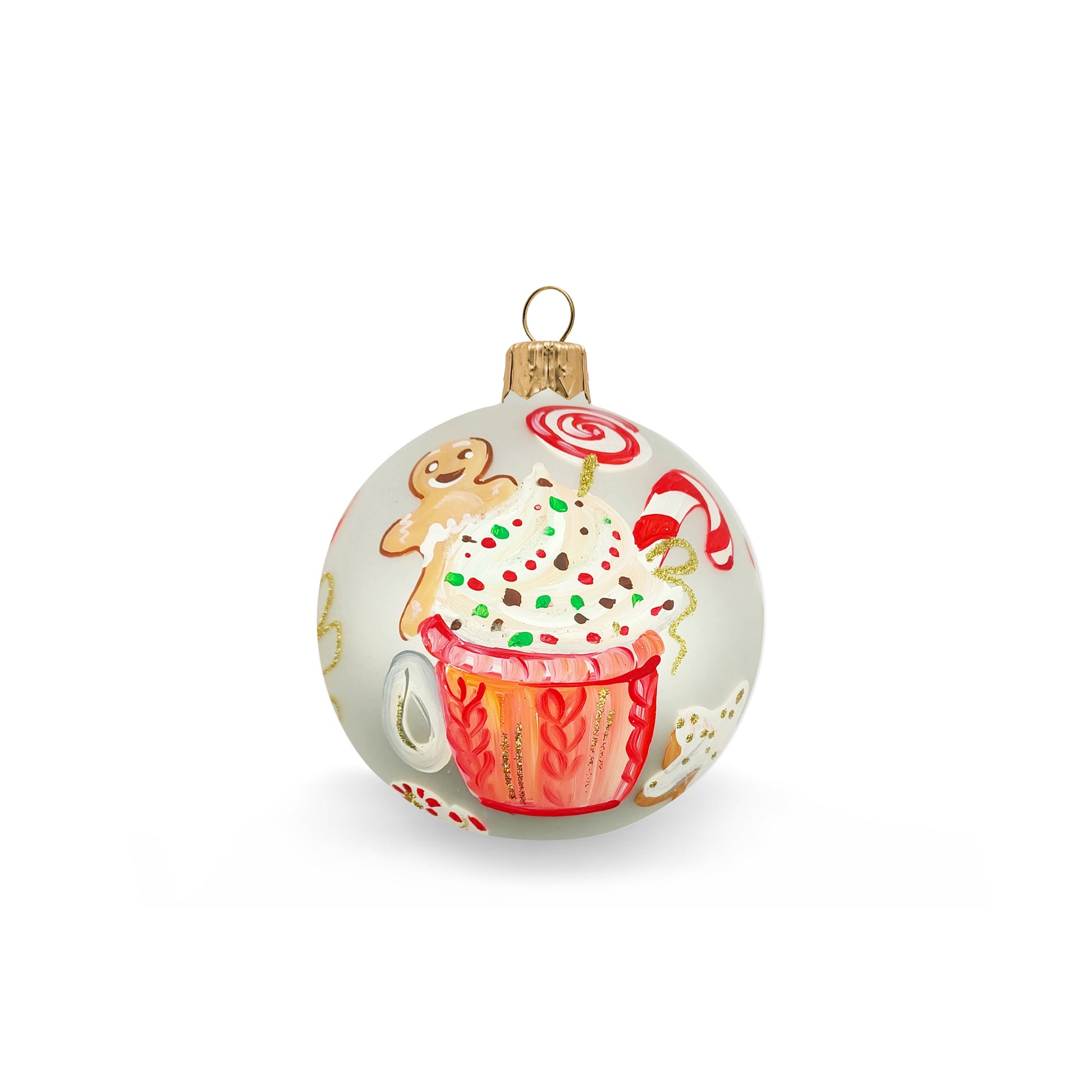 Hand painted, subject of cupcake and ginger man.