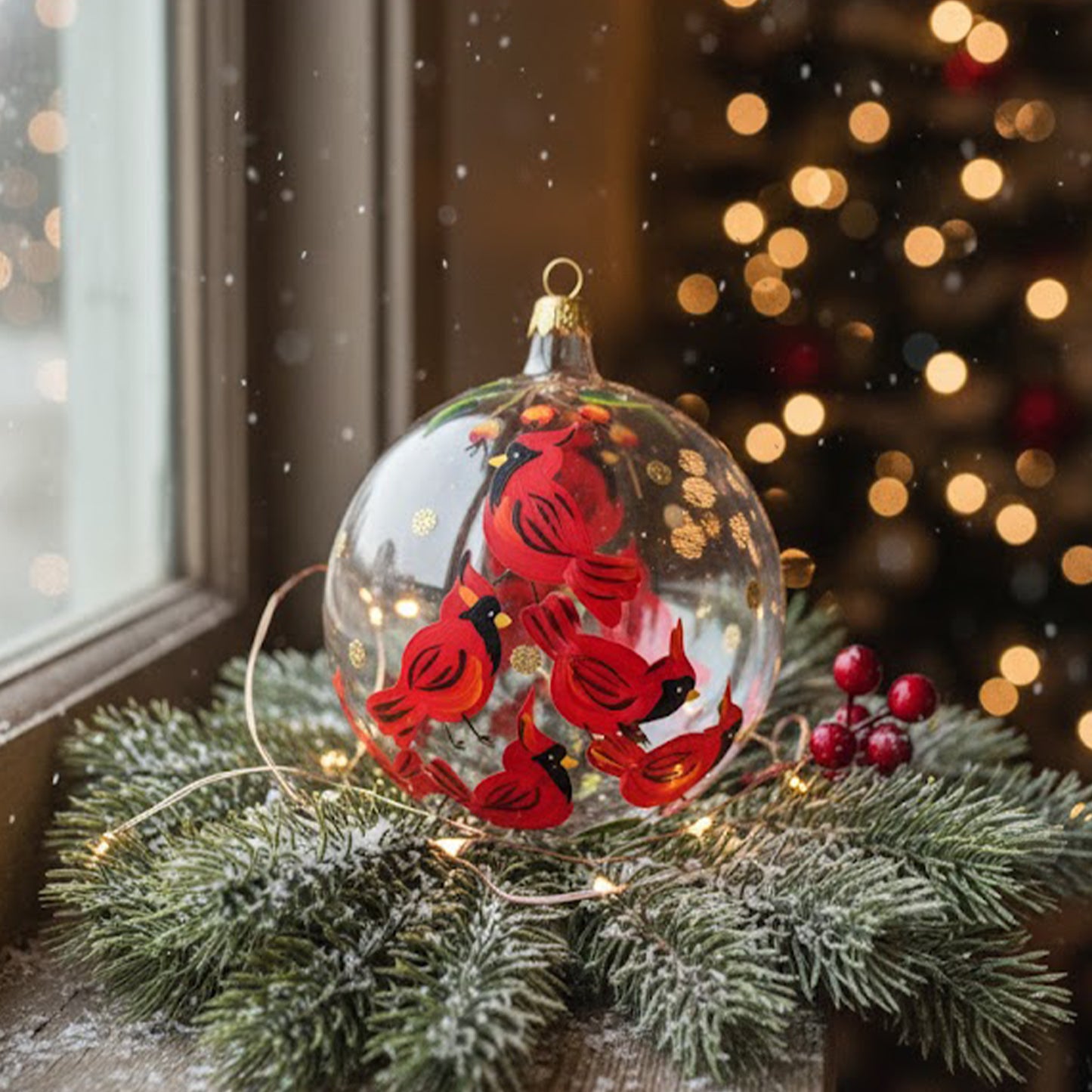 The decoration depicts a flock of red cardinals, painted in intense shades of vermilion and burgundy. The overlapping brushstrokes recreate the softness of the feathers, while the black details of the eyes and beak add expressiveness and character. The contrast between the bright red of the birds and the transparency of the glass creates a light, suspended effect.