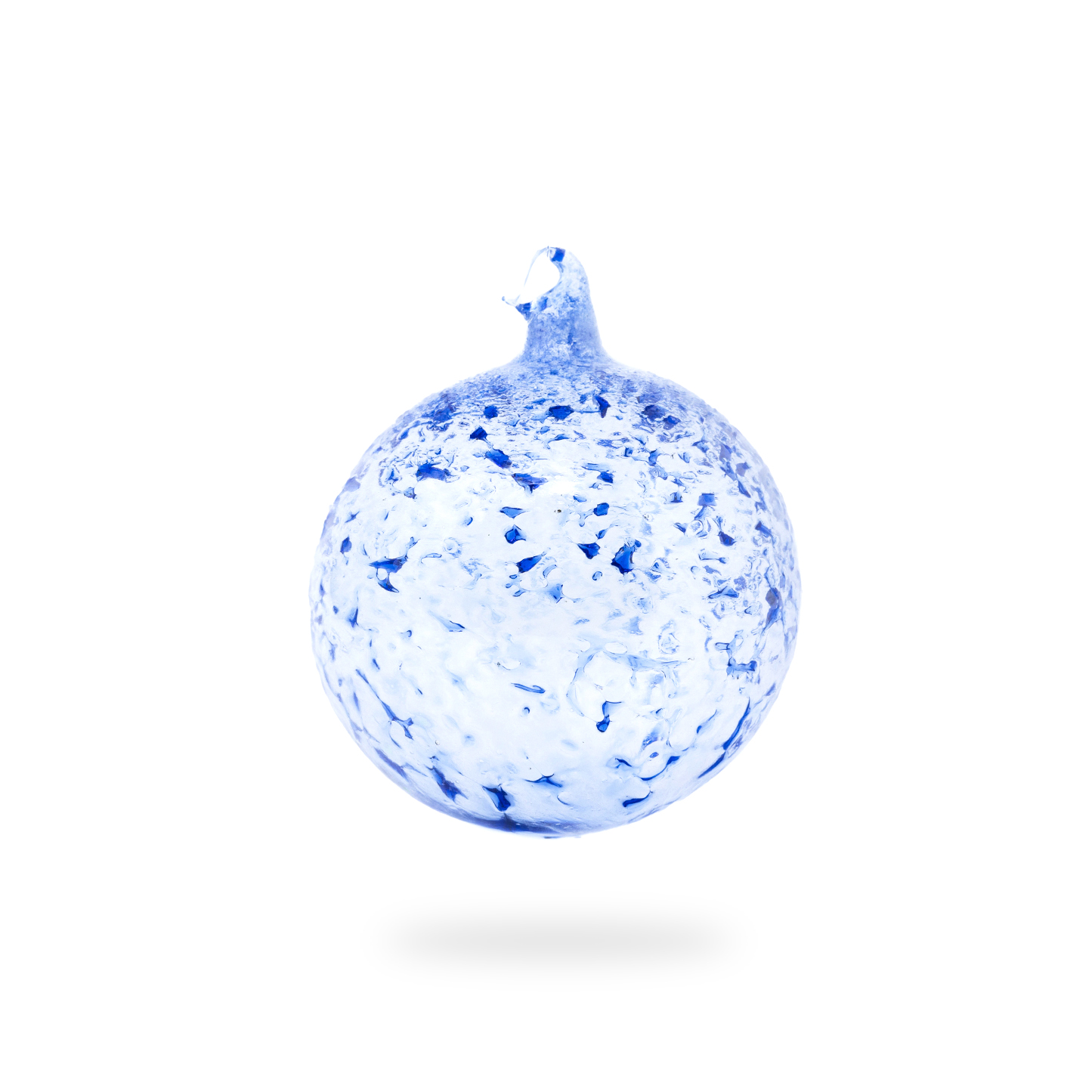 Palla di Natale Ø 100mm, in vetro soffiato trasparente con all'interno scaglie di vetro blu e gancio.