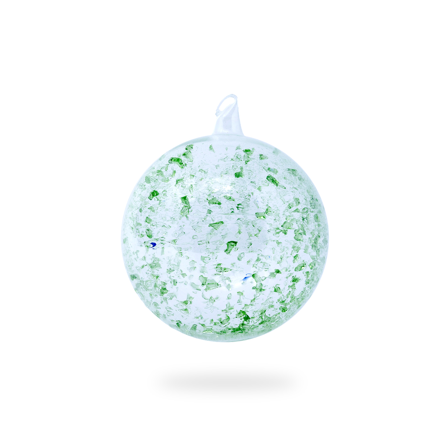 Palla di Natale Ø 100mm, in vetro soffiato trasparente con all'interno scaglie di vetro verde e gancio.