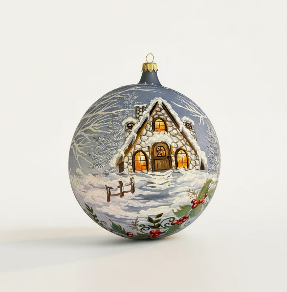 Questa sfera da Ø 150 mm è realizzata in vetro borosilicato soffiato a bocca e decorata interamente a mano nel nostro laboratorio di Bellagio. La superficie opaca sfuma dal grigio-blu al perla, creando un fondo morbido che accoglie una scena invernale luminosa e dettagliata.