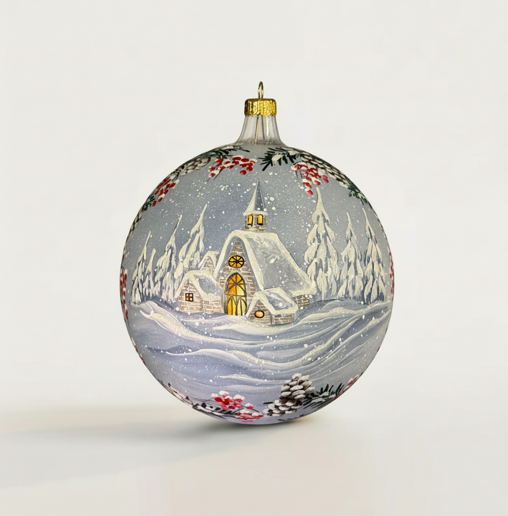 Questa sfera da Ø 150 mm è realizzata in vetro borosilicato soffiato a bocca e decorata interamente a mano nel nostro laboratorio di Bellagio. La base opaca nei toni del grigio ghiaccio crea un’atmosfera luminosa e ovattata, perfetta per accogliere la scena invernale dipinta.
