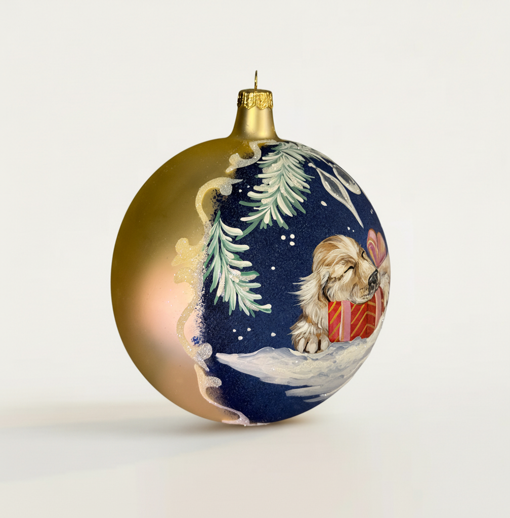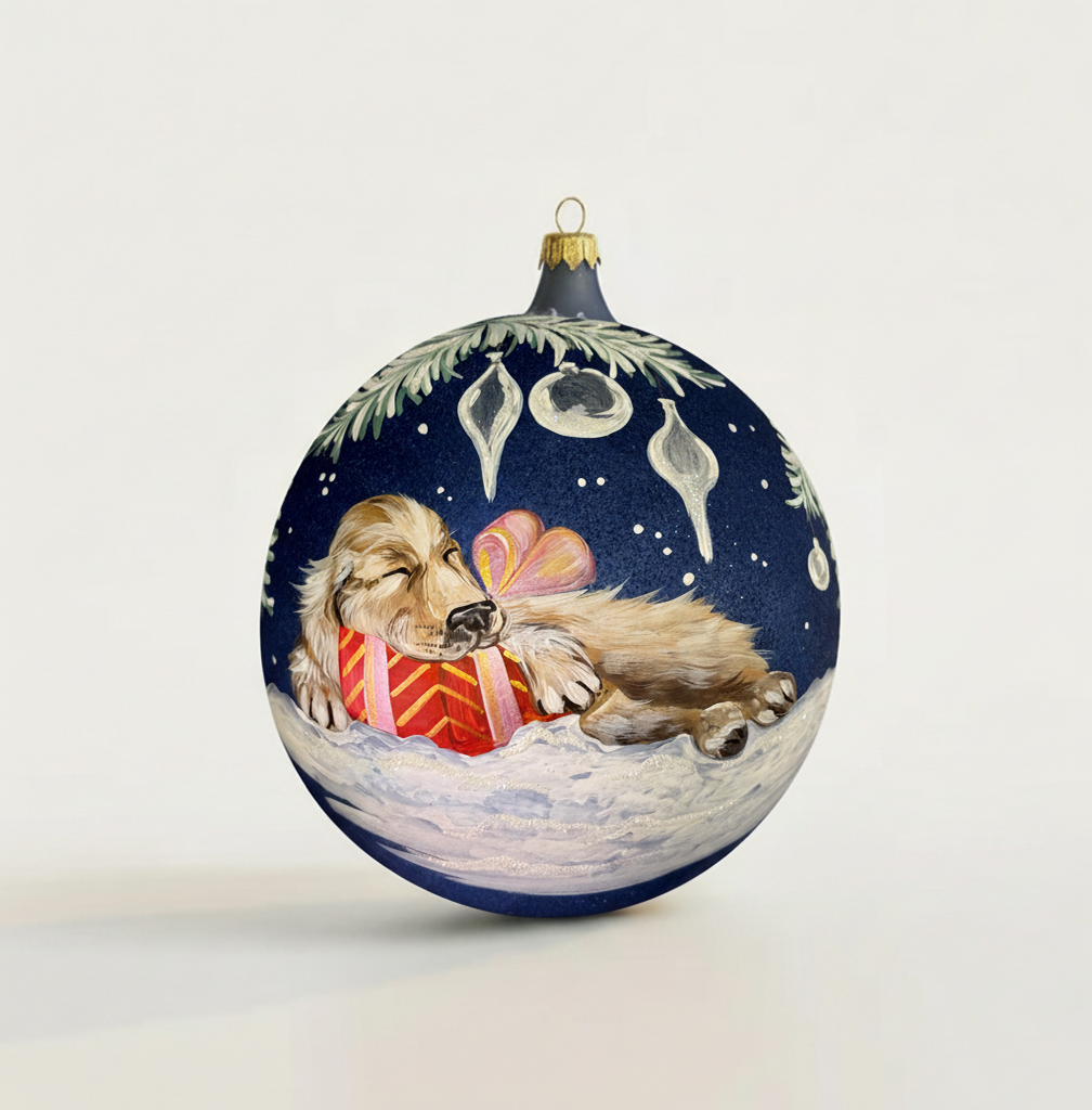 Questa sfera da Ø 150 mm è realizzata in vetro borosilicato soffiato a bocca e decorata interamente a mano nel nostro laboratorio di Bellagio. Il fronte raffigura un cucciolo addormentato sulla neve, dipinto con toni morbidi di beige, crema e marrone chiaro, con pennellate leggere che rendono il manto soffice e naturale. Il cagnolino riposa accanto a un pacco regalo rosso e arancio, rifinito con un fiocco rosa iridescente che illumina la scena.