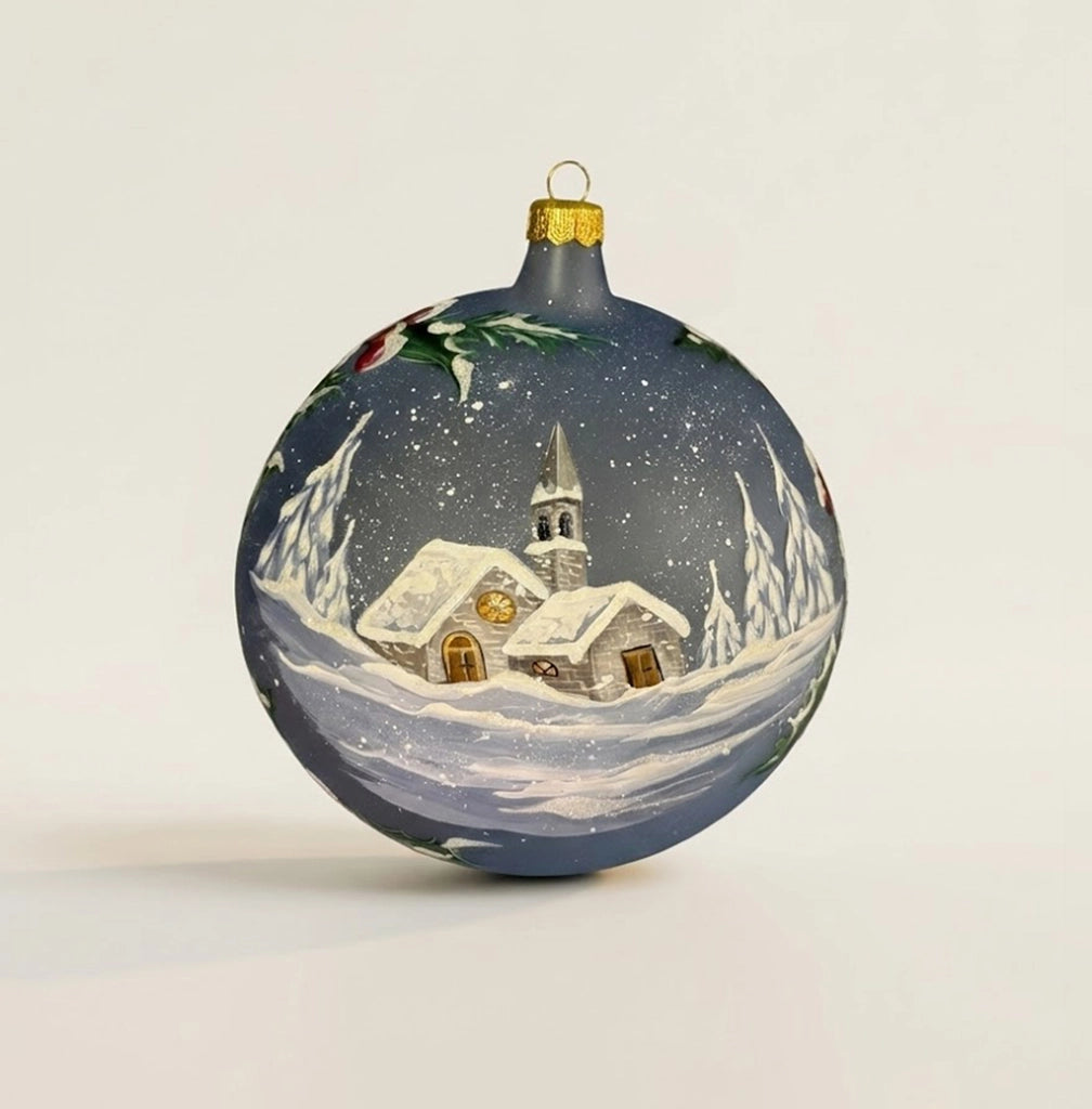 Questa sfera da Ø 150 mm è realizzata in vetro borosilicato soffiato a bocca e decorata interamente a mano nel nostro laboratorio di Bellagio. La superficie opaca, nelle sfumature del grigio-blu, fa da base a una scena invernale classica e luminosa, resa con la precisione e la morbidezza del tratto artigianale.